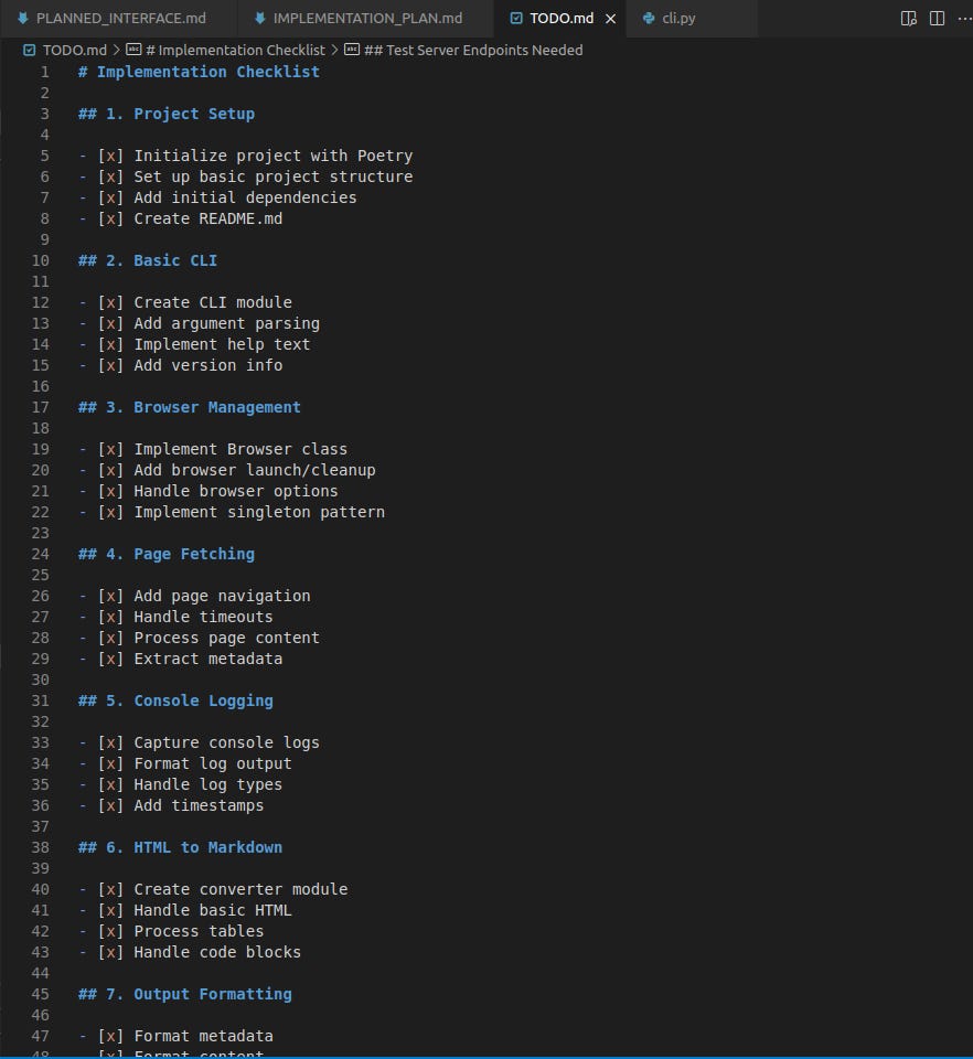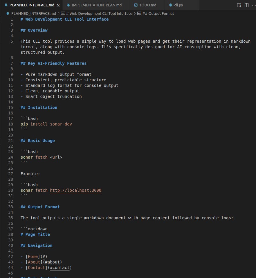 We're building a CLI tool to aid web development. We want to let an AI use this CLI tool to load a webpage it's developing and get console logs and a representation of the webpage. This representation will only be markdown to start off (HTML -> markdown). We will add other things later. Use markdownify and playwright and poetry. Think through step by step how to make this very easy to use for an end user. Focus only on the interface for now (don't think about the implementation yet). Write your plan in PLANNED_INTERFACE.md